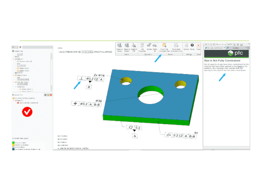 Creo GD&T Advisor is used as a guidance tool for 3D annotation of your models. The tool provides real-time feedback on: